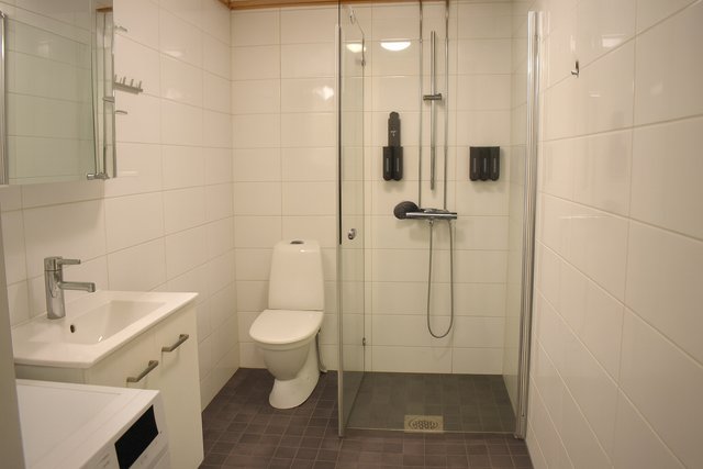 - WC-istuin, suihku, suihkukaappi, pesukoneliitäntä, peilikaappi, pesuallas, allaskaappi, bidee-suihku, ja lattialämmitys