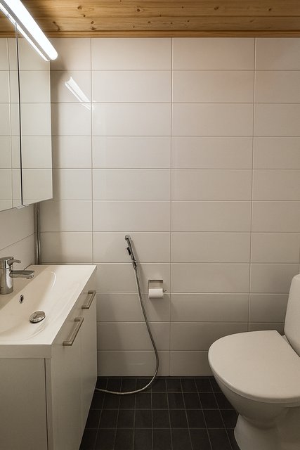 - WC-istuin, suihku, suihkuseinä, pesukoneliitäntä, peilikaappi, pesuallas, allaskaappi, bidee-suihku, ja lattialämmitys