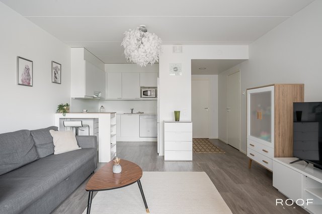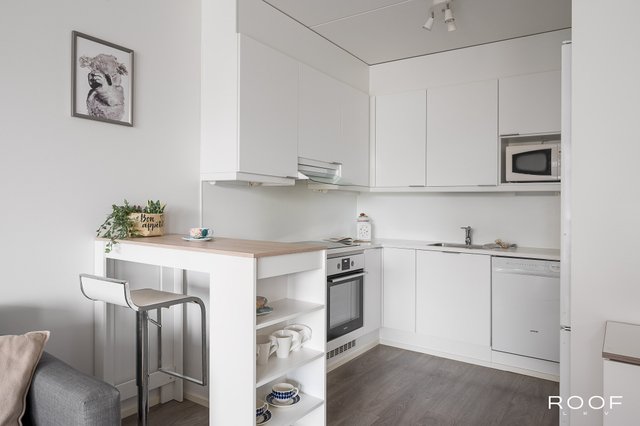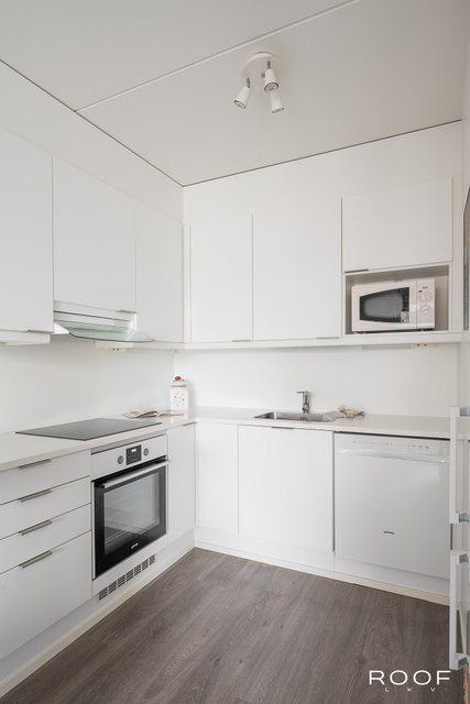 Asunnon keittiö on varustettu nykyaikaisilla laitteilla, kuten induktioliesi ja astianpesukone, mikä tekee arjen askareista sujuvia. Kylpyhuoneessa on lattialämmitys ja tilaa pesukoneelle, mikä lisää asumismukavuutta. Makuuhuoneessa on kätevä vaatehuone, joka tarjoaa runsaasti säilytystilaa.