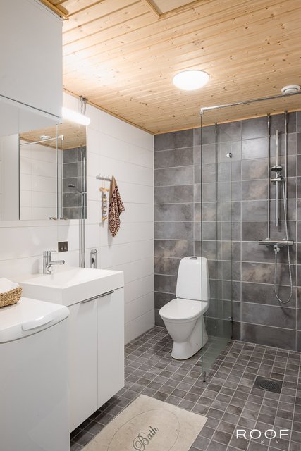- Suihku, wc-istuin, suihkuseinä, pesukoneliitäntä, lattialämmitys, bidee-suihku, allaskaappi, peilikaappi, ja pesuallas
