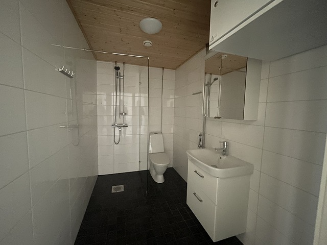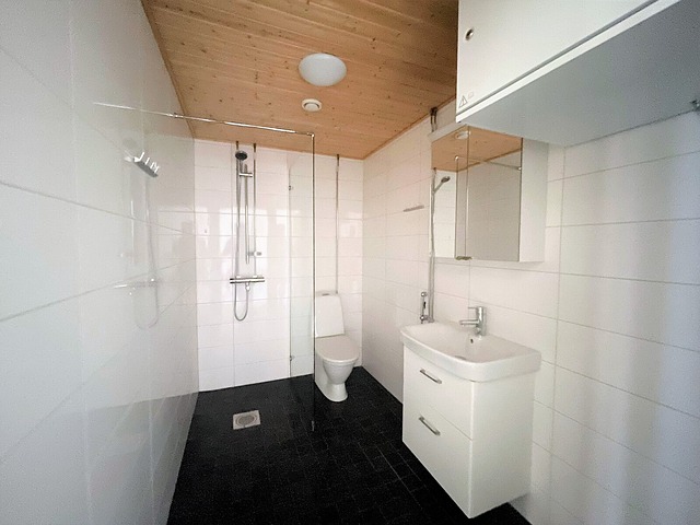- Suihkuseinä, pesukoneliitäntä, wc-istuin, ja suihku