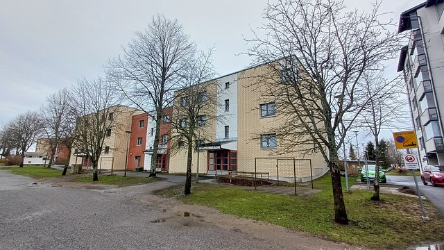 - Noin lounas, piha, viheralue, puita, kerrostaloja; noin koillinen Jukolan alakoulun koulurakennuksia