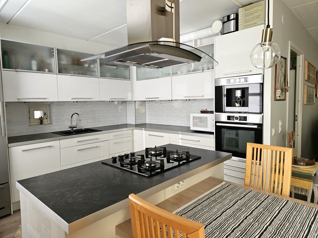 Asunnon keittiö täyttää ammattikokinkin vaatimukset, mm. liesitaso kaasulla, erillisuuni sekä reilusti työpöytätilaa.