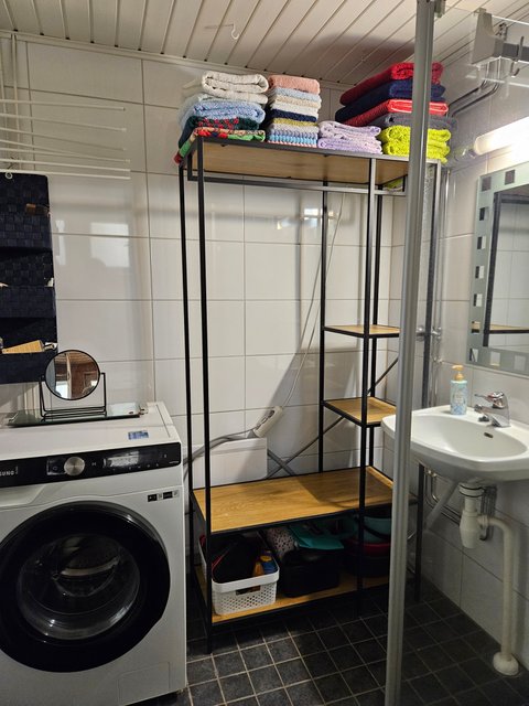 - Suihku, suihkuseinä, pesukoneliitäntä, lattialämmitys, pesuallas, peili, ja kaapisto