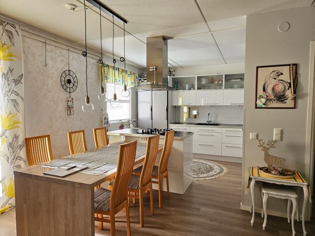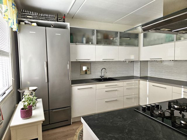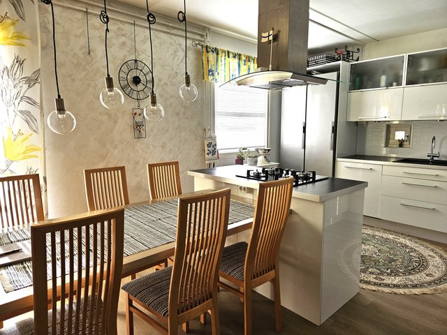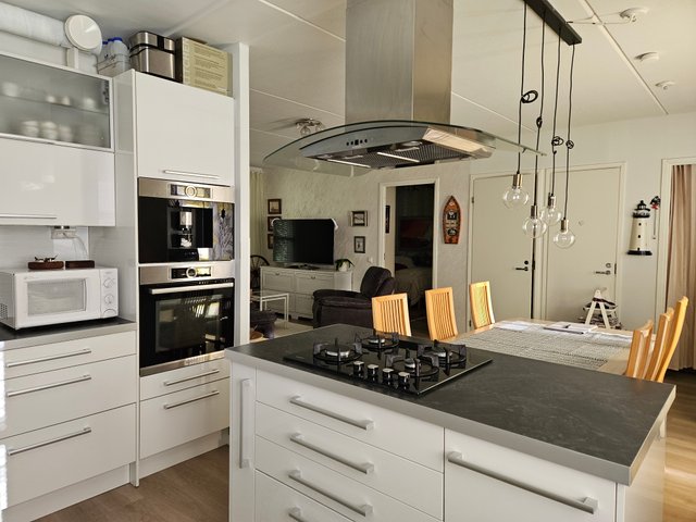 - Jääkaappi, erillinen pakastin, liesituuletin, astianpesukone, keittiösaareke, ja erillisuuni, jossa höyrytystoiminto ja grilli
