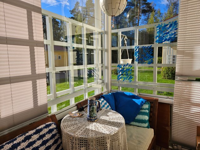 Asunnon lasitettu terassi tarjoaa ihanteellisen paikan nauttia auringonpaisteesta.