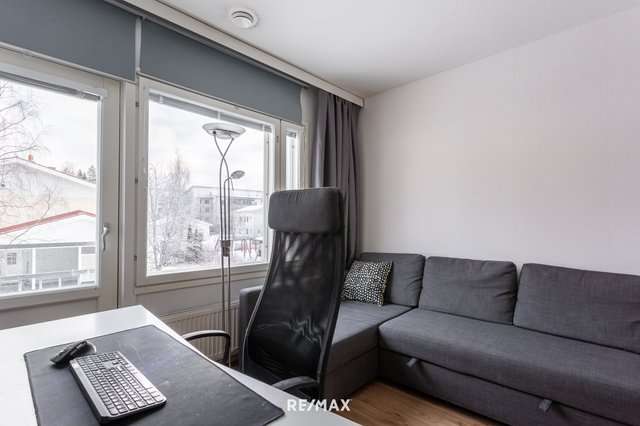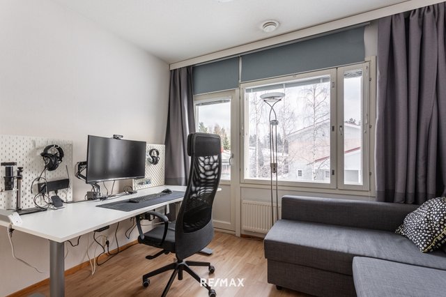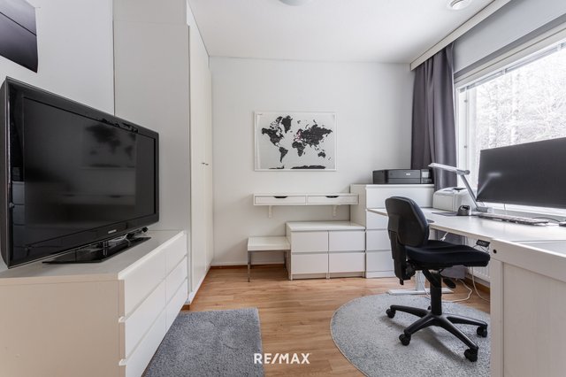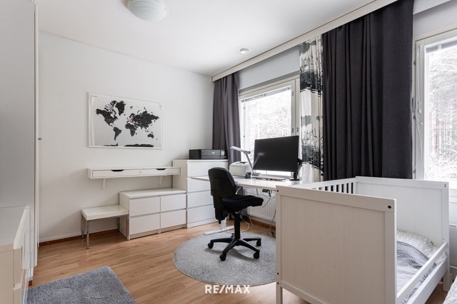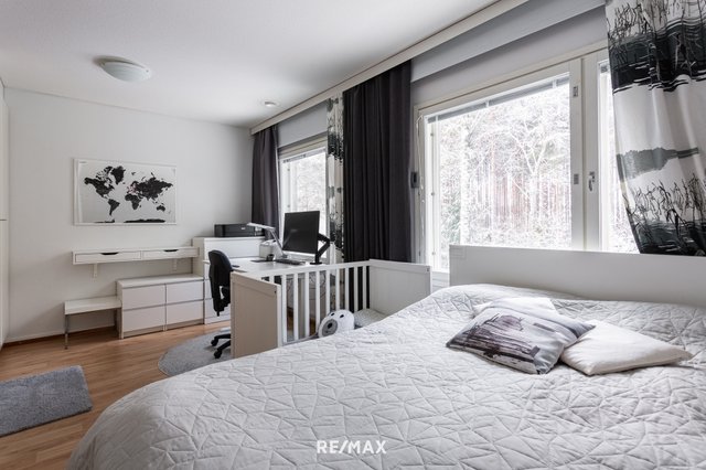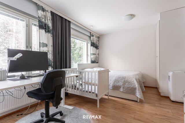 - Isoin makuuhuone on mahdollista jakaa väliseinällä kahdeksi makuuhuoneeksi, jolloin asuntoon saadaan 3 makuuhuonetta. Ison makuuhuoneen yksi seinä on akustiikkatapetoitu. Sen päälle on mahdollista maalata/tapetoida. Muut seinät on maalattu/tapetoitu. Pienemmän makuuhuoneen seinät on tapetoitu.