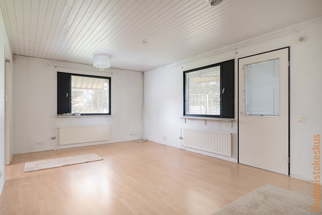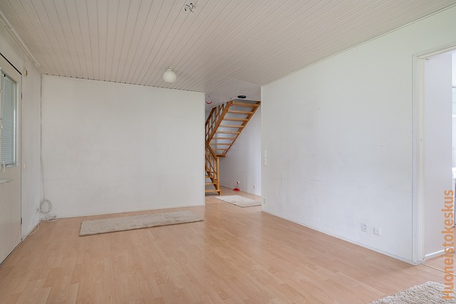 - parketti yläkerran huoneet, laminaatti alakerrassa, laatta kosteat tilat