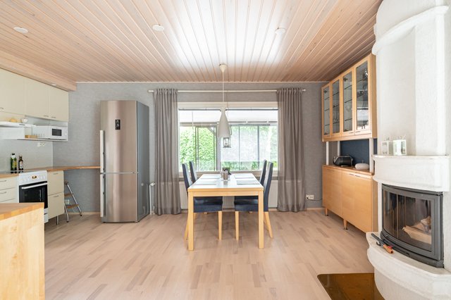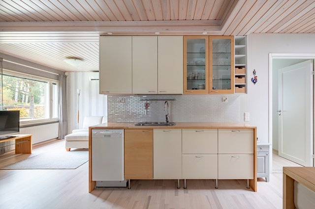 - Parkettilattia, seinät tapetoitu, välitilassa laatta, työtaso: puu, astianpesukone, jääkaappi/pakastin, keraaminen liesi, liesituuletin