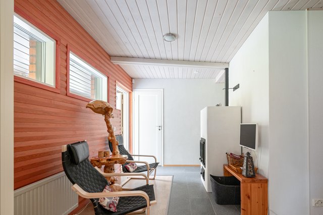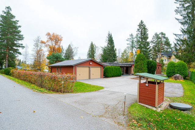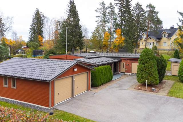 - Eteinen: Laattalattia, seinät tapetoitu, kaapisto, lattialämmitys Takkahuone: Korkki- ja laattalattia, varaava takka, seinät maalattu ja paneloitu, lattialämmitys. Takkahuoneesta käynti takapihan terassille Tekninen tila: Maalattu betonilattia, seinät maalattu, lämmönjakokeskus Aulatila: Parkettilattia, seinät tapetoitu, vaatekaappi, siivouskaappi Etelän-lounaan suuntainen katettu lasiterassi: Pituus 7,90 m, leveys 3,20 m Kylmä autotalli kahdelle autolle: Leveys 6,0 m, pituus 6,0 m, korkeus 2,10 m. Autotallin yhteydessä kylmä varastotila: Pituus 6,0 m, leveys 2,20 m. Asunnon yhteydessä oleva lämmin autotalli: Pituus on 4,30 m, leveys 2,95 m, korkeus 2,60 m Kaksi kylmää ulkovarastoa