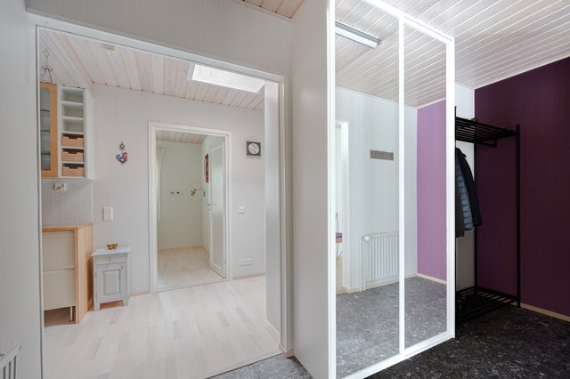 - Vinyylilaattalattia, seinät maalattu, pesukoneliitäntä, kuivauskaappi. Kodinhoitohuoneesta kulku suoraan ulos.