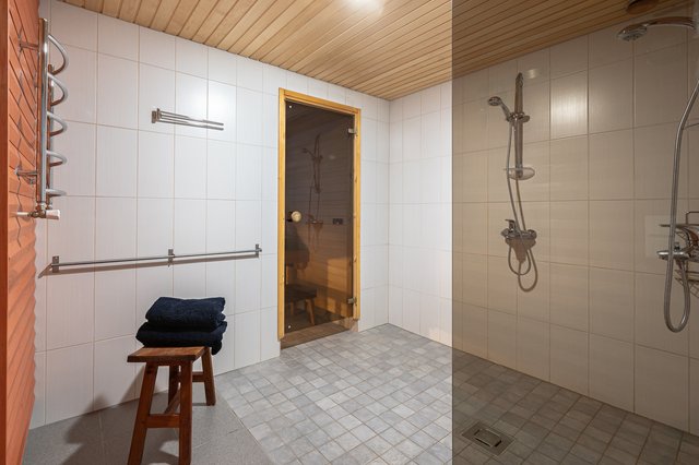 - Laattalattia, paneeliseinät, kaksi suihkua, suihkujen seinät laatoitettu, lattialämmitys