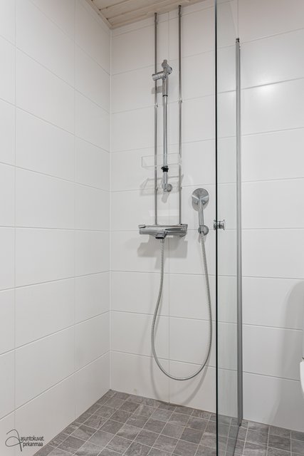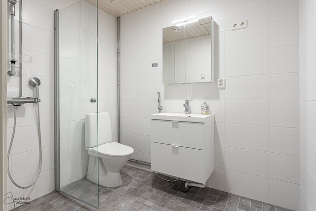- WC-istuin, suihku, lattialämmitys, allaskaappi, peilikaappi, pesukoneliitäntä, ja suihkuseinä