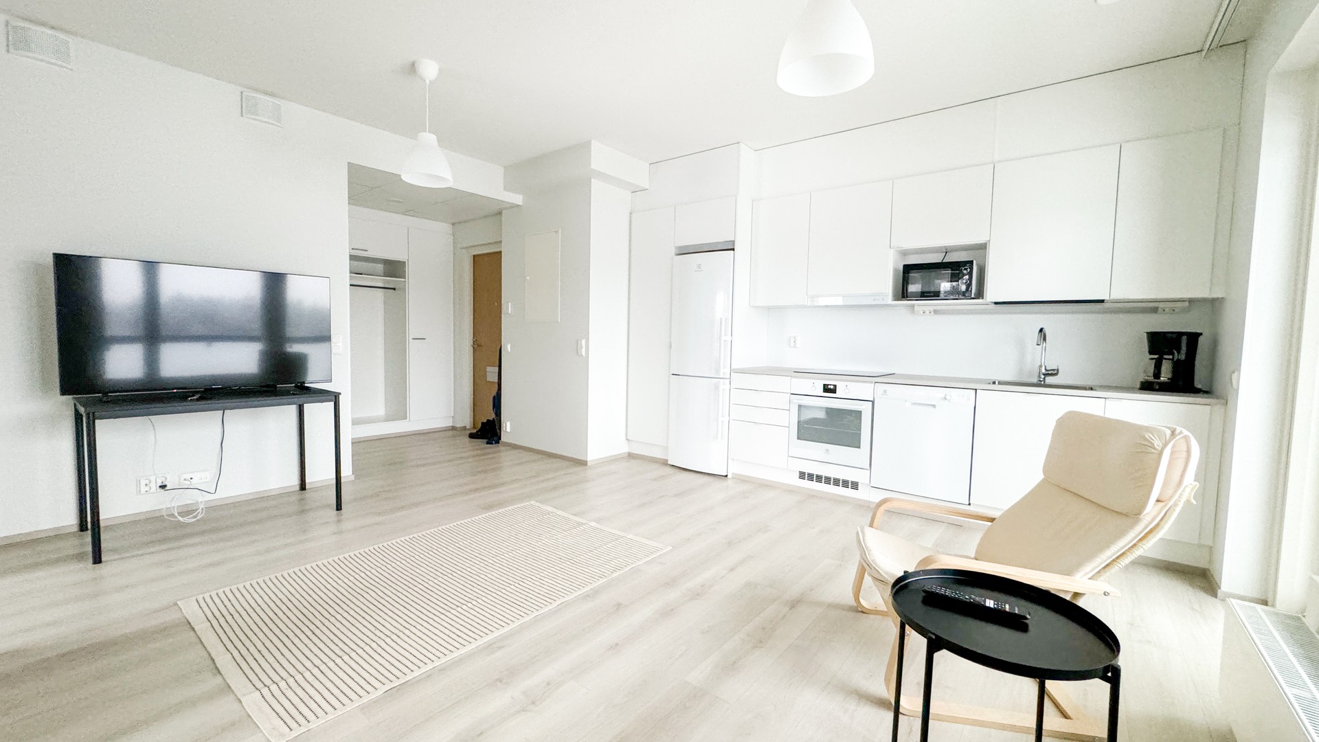 Tämä moderni koti hurmaa selkeällä pohjaratkaisullaan ja avaralla avokeittiöllään, jossa yhdistyvät korkealuokkaiset kodinkoneet, laadukkaat pinnat ja ajaton tyyli. Suuret ikkunat täyttävät tilan valolla ja lasitettu parveke jatkaa oleskelutilaa ympäri vuoden. Se on täydellinen paikka aamukahville tai iltahetkiin.