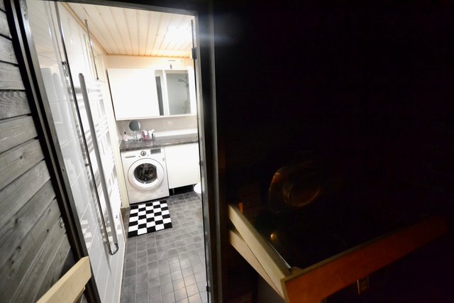 - Tyylikäs ja uusittu kylpytila näppärällä kodinhoitonurkkauksella.