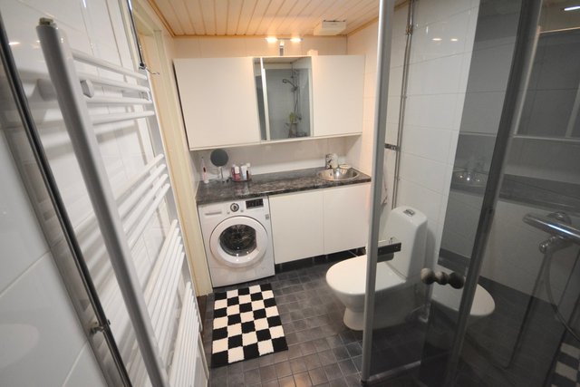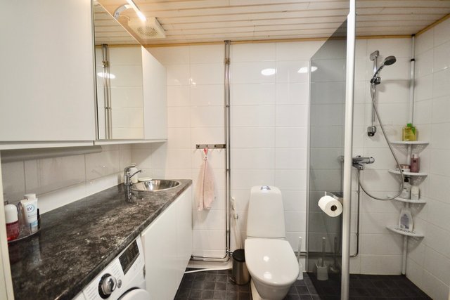 - WC-istuin, suihku, suihkuseinä, pesukoneliitäntä, lattialämmitys, peilikaappi, pesuallas, ja bidee-suihku