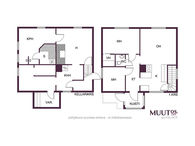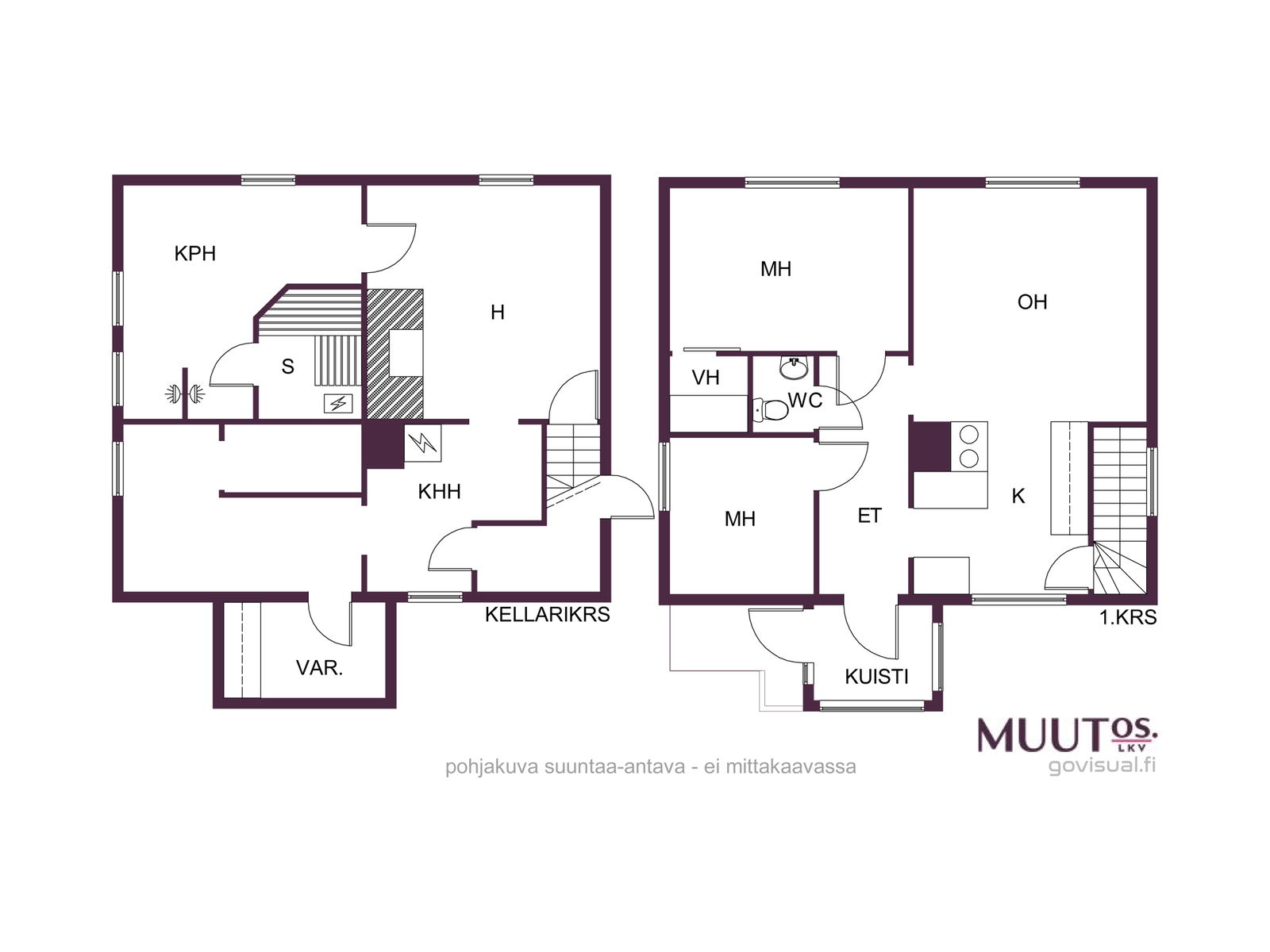 - Pinta-alat perustuvat myyjältä saatuihin tietoihin ja rakennuspiirustuksista laskettuihin arvioihin. Pinta-aloja ei ole tarkistusmitattu, mitattaessa pinta-alat saattavat olla ilmoitettua suurempia tai pienempiä. Kohteen kauppahinta ei ole osaksikaan pinta-alaperusteinen vaan perustuu kokonaisuuteen. Rakennuspiirustusten mukainen kerrosala 59 m2. Asuintilojen pinta-ala on laskettu rakennuspiirustuksista ja siihen on huomioitu kaikki asuinkäytössä olevat tilat, muihin tiloihin on laskettu kellari.
