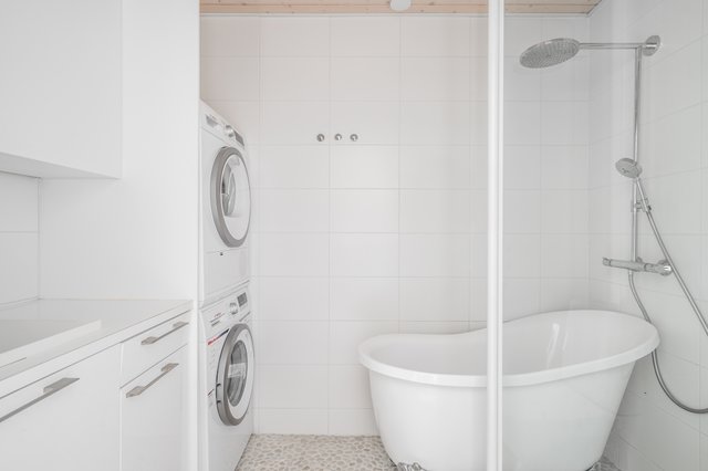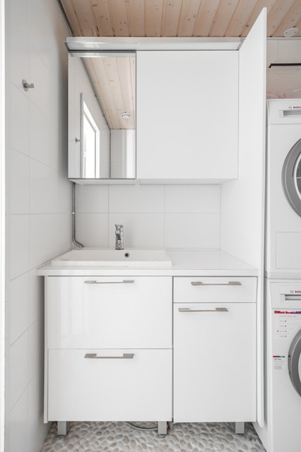 - VARUSTUS: Suihku, Suihkuseinä, Wc istuin, Pesukoneliitäntä, Hana, Allas, Peilikaappi, Allaskaapisto, Lattialämmitys SEINÄT: Laatta LATTIA: Pebble stone (kivi) KYLPYHUONE 2 - VARUSTUS: Suihku, Suihkuseinä, Wc istuin, Hana, Allas, Peilikaappi, Allaskaapisto, Lattialämmitys, Vesikiertoiseen lämmitykseen liitetty kuivausteline (rättipatteri) SEINÄT / LATTIA: Laatta