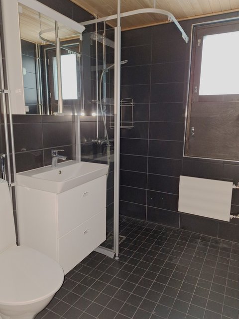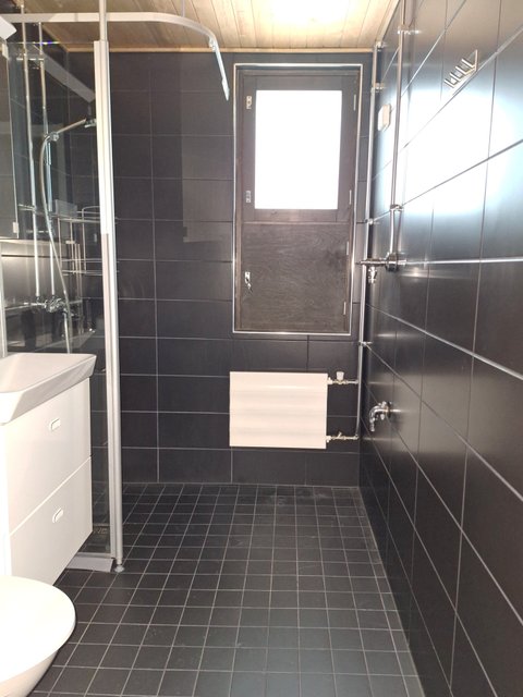 - WC-istuin, suihkuseinä, pesukoneliitäntä, peilikaappi, pesuallas, bidee-suihku, allaskaappi, suihku, ja ikkuna