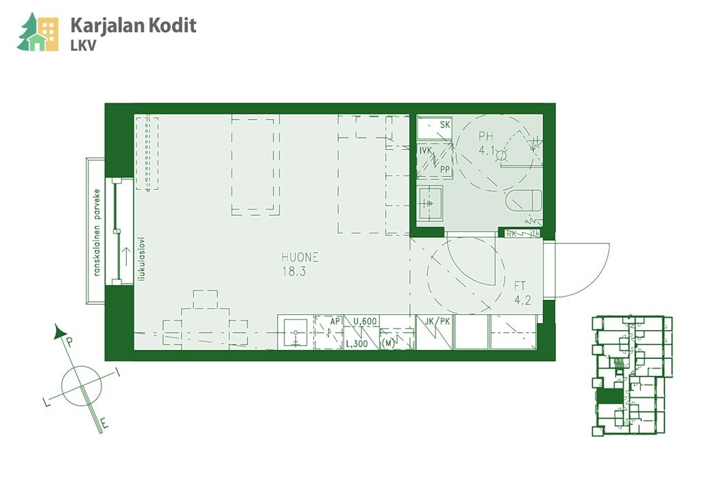 Tämä 27 neliön asunto sijaitsee alkuvuodesta 2027 valmistuvassa Asunto Oy Joensuun Jokelassa. Kolmannessa kerroksessa sijaitseva koti tarjoaa upeat näkymät luoteeseen suuntautuvalta parvekkeelta.