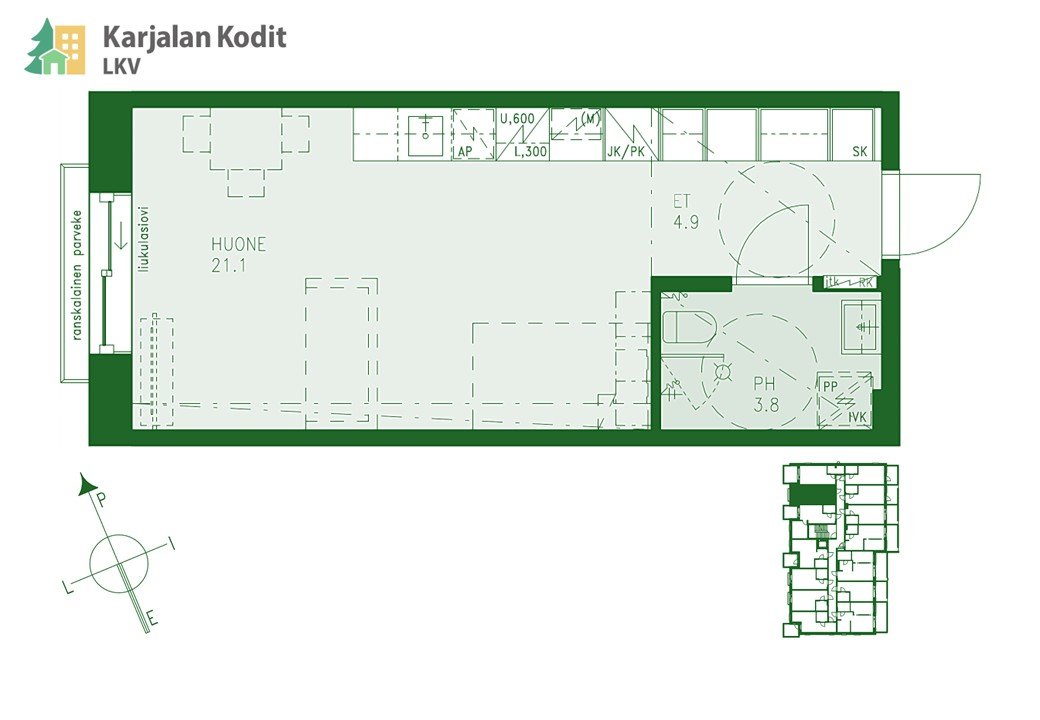 Tämä 30,5 neliön asunto sijaitsee alkuvuodesta 2027 valmistuvassa Asunto Oy Joensuun Jokelassa. Toisessa kerroksessa sijaitseva koti tarjoaa upeat näkymät luoteeseen suuntautuvalta parvekkeelta.