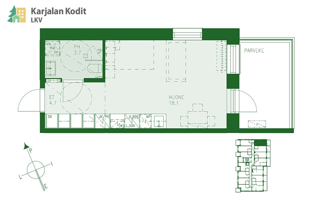 Tämä 27 neliön asunto sijaitsee alkuvuodesta 2027 valmistuvassa Asunto Oy Joensuun Jokelassa. Toisessa kerroksessa sijaitseva koti tarjoaa upeat näkymät kaakkoon suuntautuvalta lasitetulta parvekkeelta.