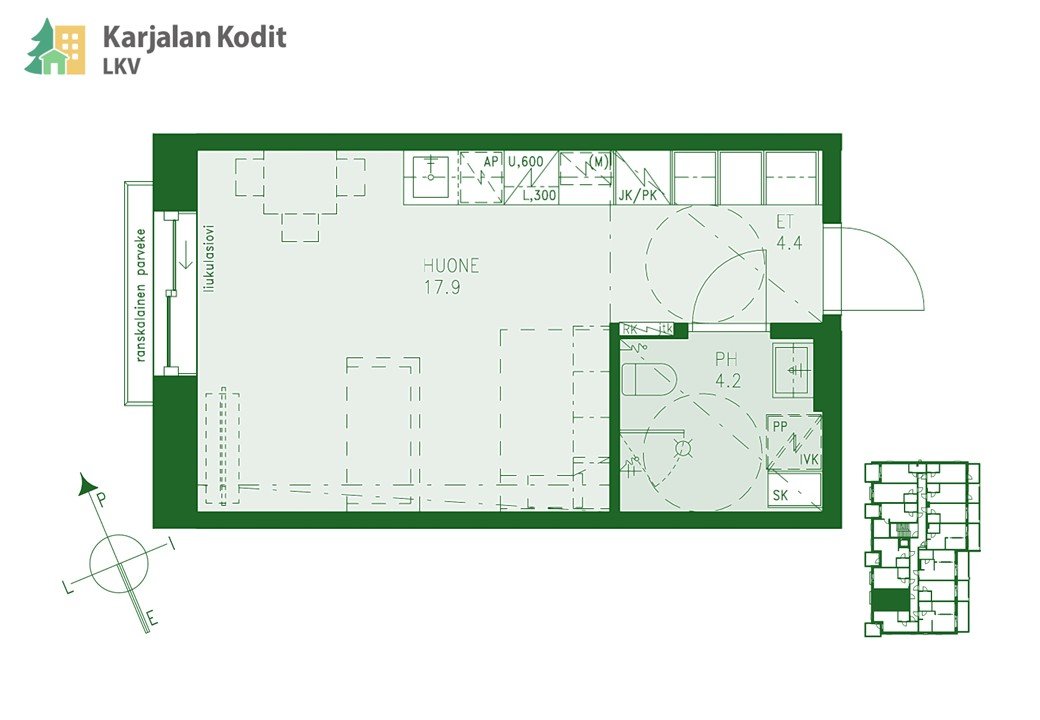 - Koneellinen ilmanvaihto ja ilmalämpöpumppuvaraus (parvekkeellisissa asunnoissa)