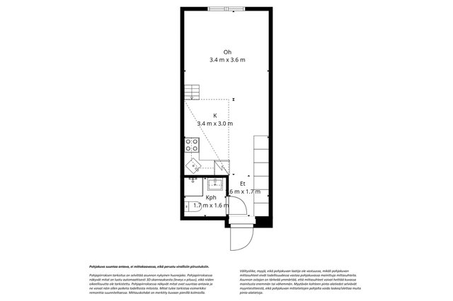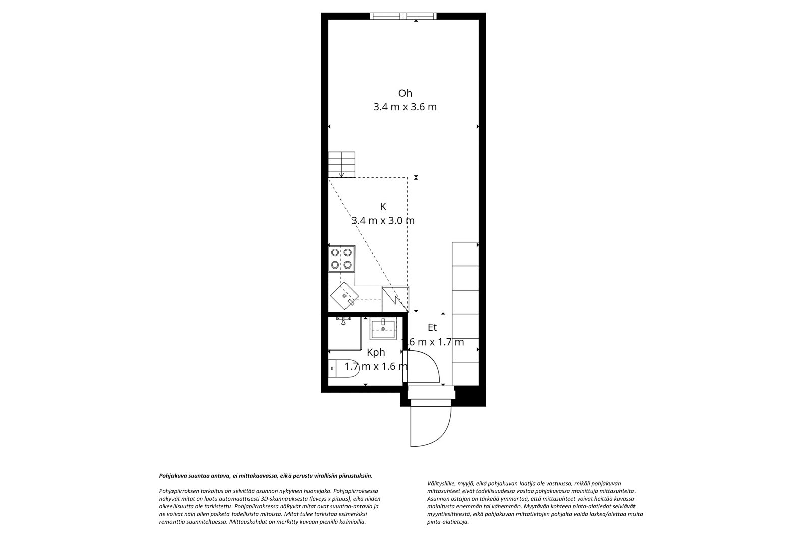 - Pinta-alaa ei ole tarkistusmitattu. Edellä mainittu pinta-ala saattaa poiketa olennaisestikin huoneiston nykyisen ja rakentamisaikaisen mittaustapojen ja standardien mukaan laskettavasta pinta-alasta. Huoneiston todellinen pinta-ala voi siis olla yhtiöjärjestksessä, isännöitsijäntodistuksessa ja esitteessä mainittua pienempi tai suurempi. Pinta-alaa ei ole mitattu SFS 5139 standardin mukaisesti.