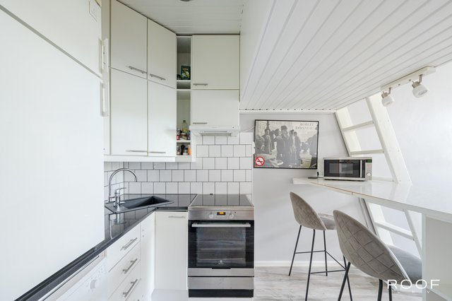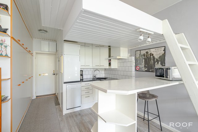 Huoneisto tarjoaa erinomaista tilankäyttöä: käytännöllinen parvi tuo lisää oleskelu- ja säilytystilaa, jättäen alakerran avaraksi ja helposti sisustettavaksi.