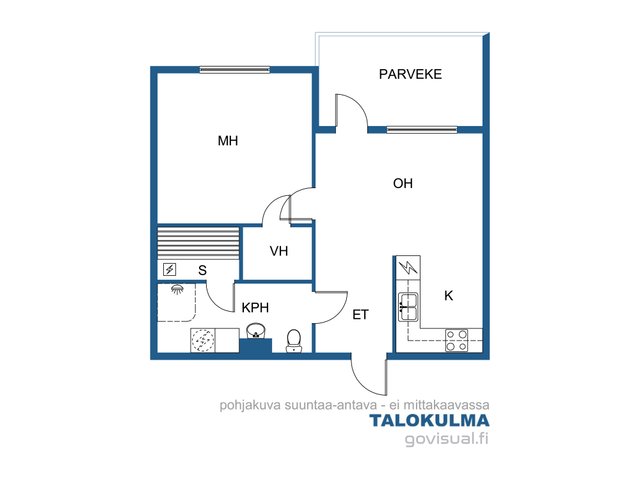 Asunnossa on avara olohuone ja kivan kokoinen makuuhuone sekä keittiö, josta löytyy kaikki tarvittava. Kaappi- ja laskutilaa on keittiössä mukavasti ja pöytä mahtuu olohuoneen puolelle helposti. Kylpyhuone on tilava ja myös pesukoneelle on kylpyhuoneessa tilaa. Kylpyhuoneen yhteydessä on huoneiston oma sauna. Olohuoneesta on kulku huoneiston lasitetulle parvekkeelle. Isolta parvekkeelta avautuvat hyvät näkymät yli alueen. Huoneistoon kuuluu lisäksi makuuhuoneessa oleva vaatehuone.