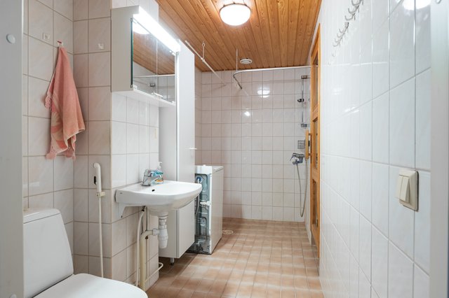 - Iso kylpyhuone jonka yhteydessä oma sauna. Pesukone mahtuu tilaan vaivatta.