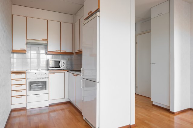 - Erillinen keittiönurkkaus olohuoneen yhteydessä. Kaappi- ja laskutilaa mukavasti. Pöytä menee huoneen puolelle.
