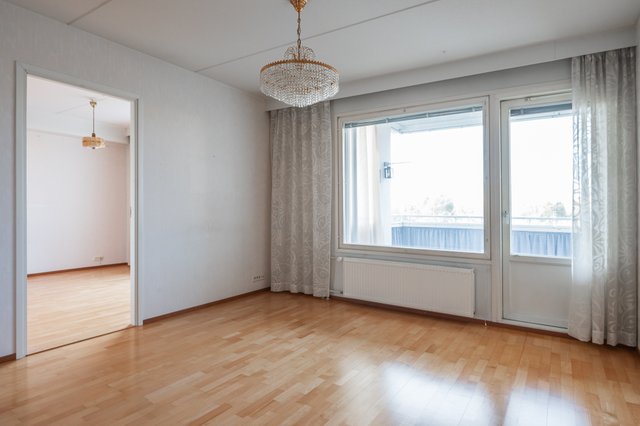 - Avara olohuone josta kulku huoneiston lasitetulle parvekkeelle.