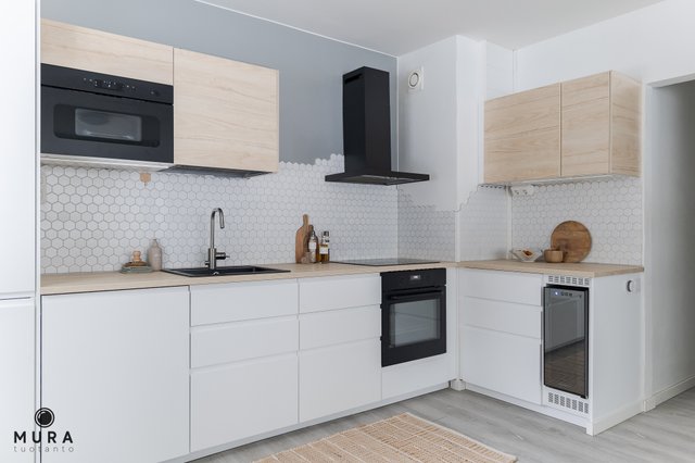 - Tyylikäs valkoinen keittiö, jossa integroitu jääkaappi/ pakastin, integroitu astianpesukone, erillisuuni, induktioliesi, liesituuletin, integroitu viinikaappi, integroitu mikroaaltouuni.