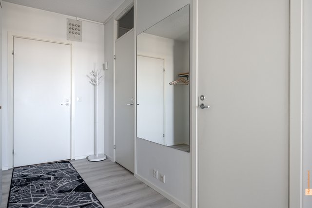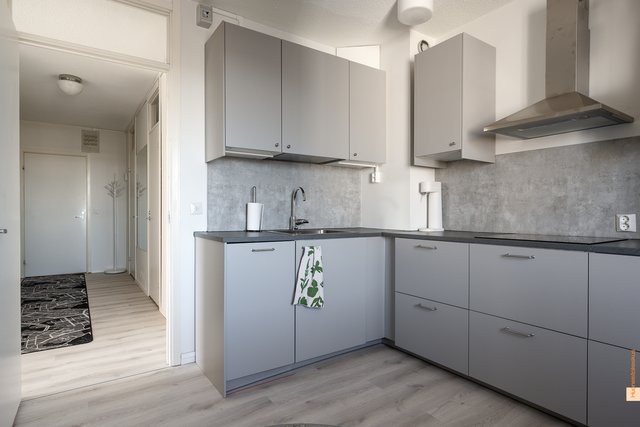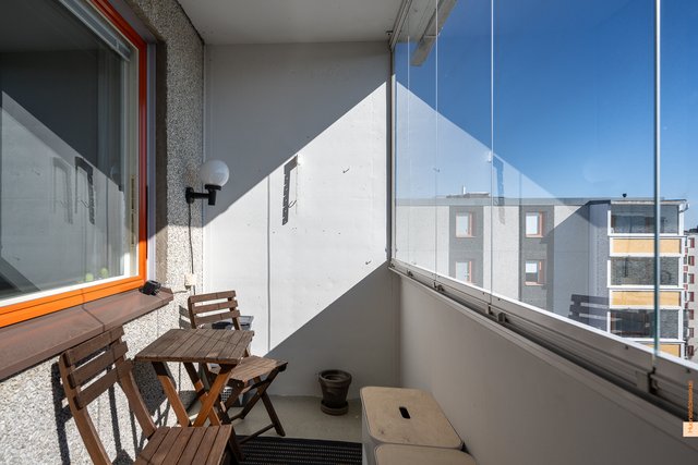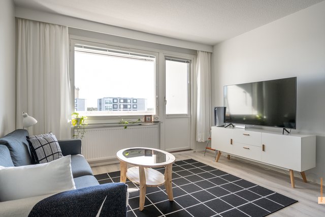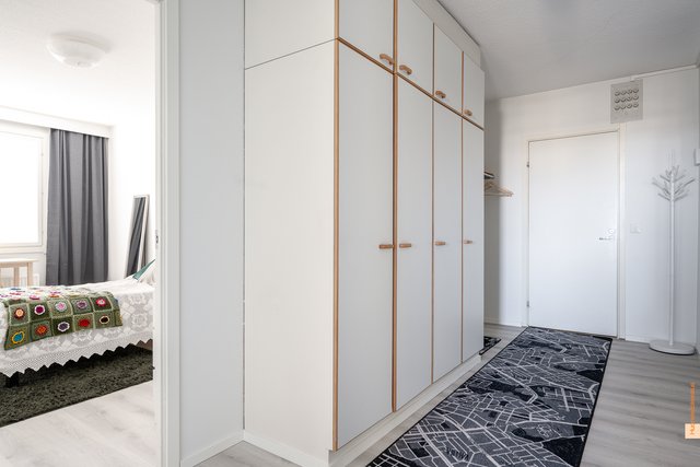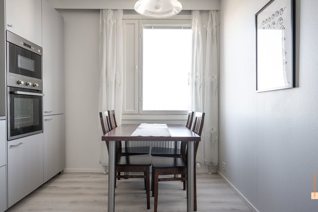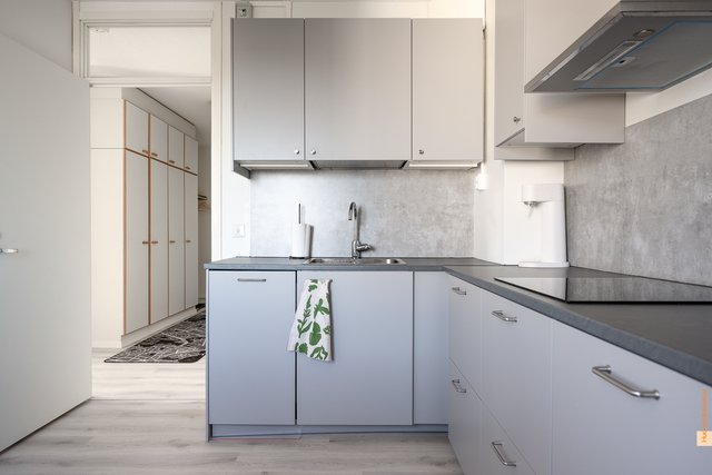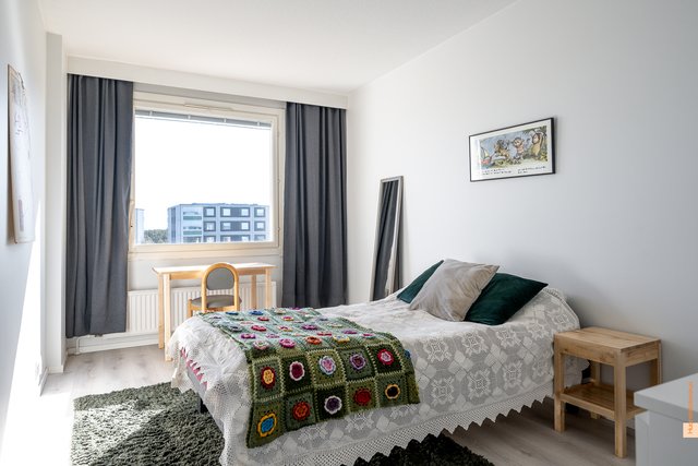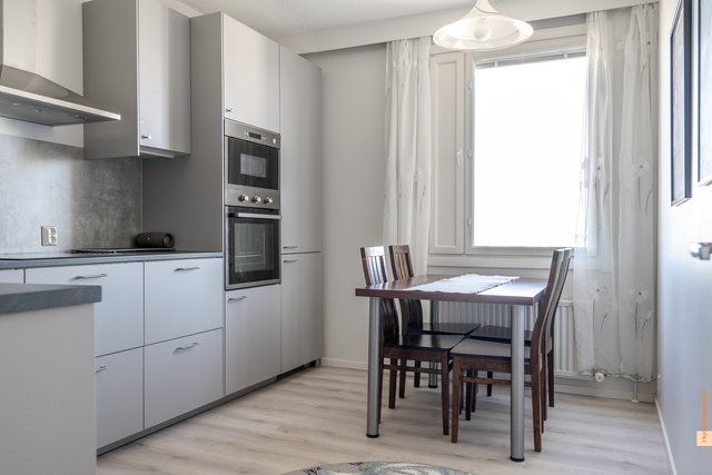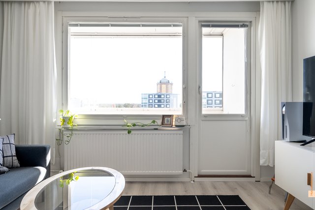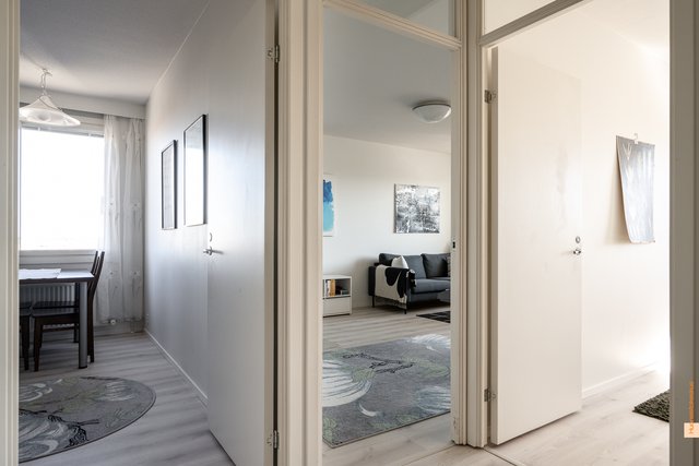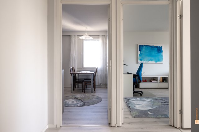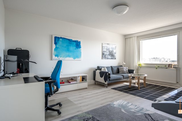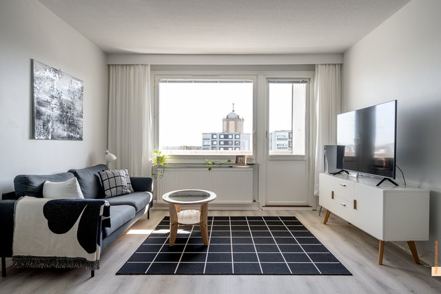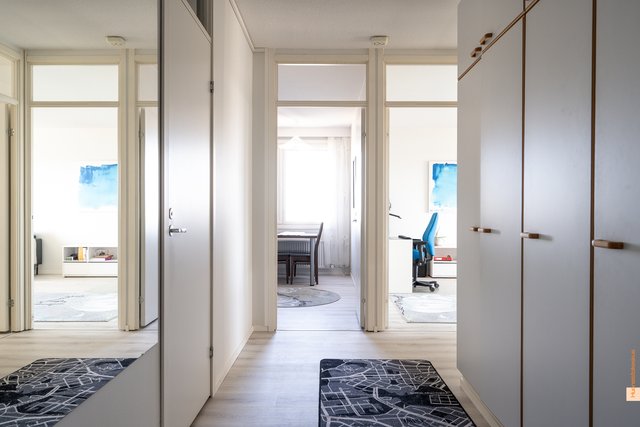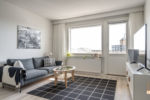 Tämä 9. kerroksen asunto on remontoitu vuonna 2024 tyylikkään ajattomasti. Lattiat ovat kestävää vinyyliä ja moderni keittiö tekee arjesta astetta helpompaa. Kylpyhuoneen kalusteet on uusittu ja näin sinnekin on saatu lisää säilytystilaa. Rakennuskannalle tyypillisesti suuret huoneet tulvivat valoa ja parvekkeelta aukeaa upeat maisemat yli kattojen.