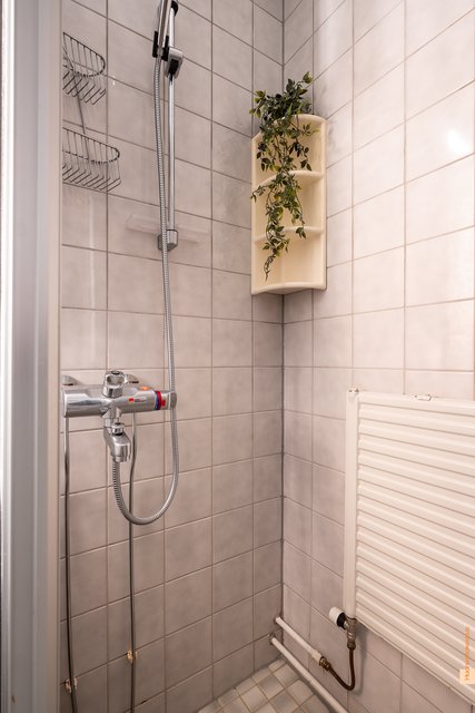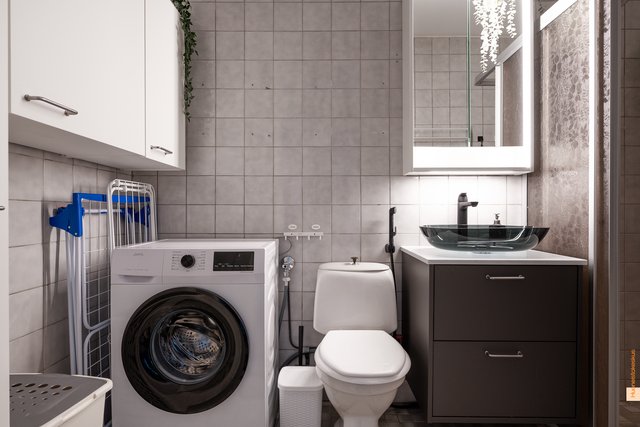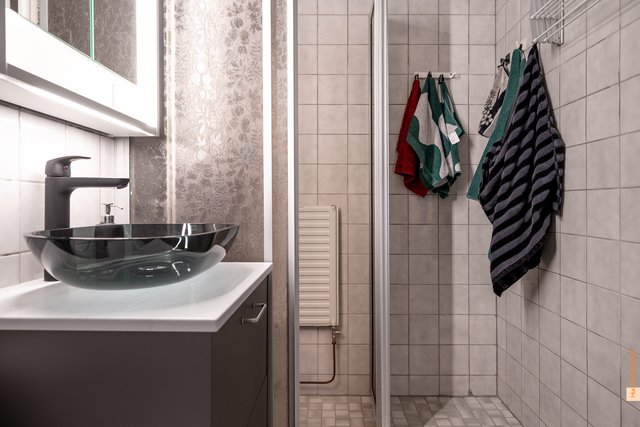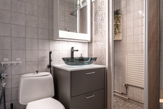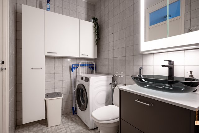 - Suihkukaappi, pesukoneliitäntä, lattialämmitys, wc-istuin, peilikaappi, ja allaskaappi