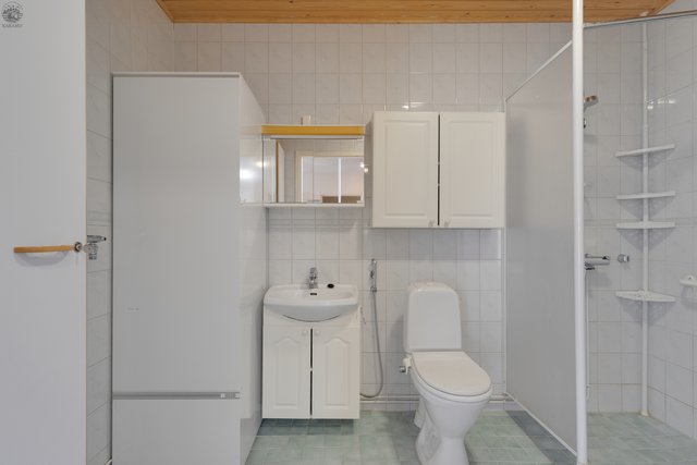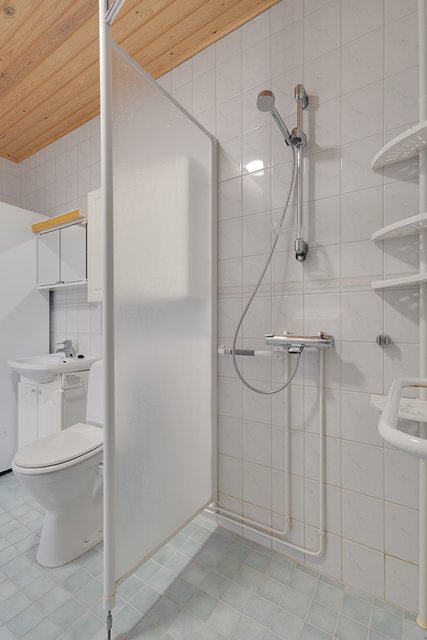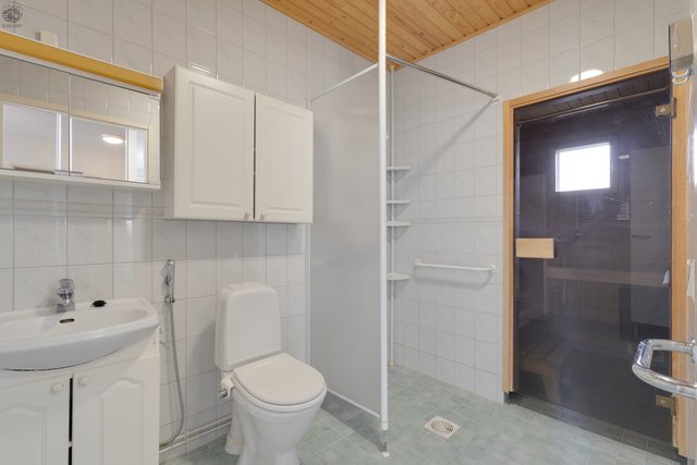 - WC-istuin, suihku, suihkuseinä, pesukoneliitäntä, peilikaappi, allaskaappi, ja bidee-suihku