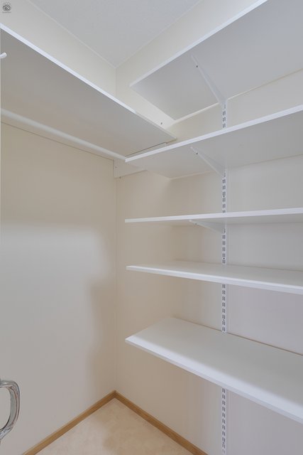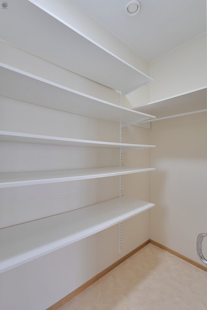Keittiö on reilunkokoinen. Makuuhuoneessa on runsaasti säilytystilaa vaatehuoneen ansiosta.