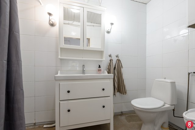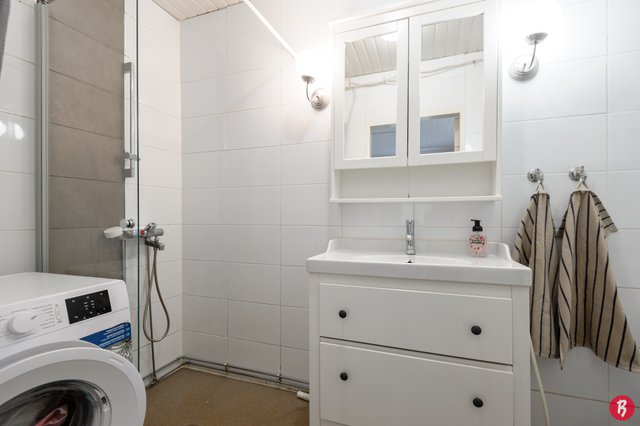 - Suihku, suihkuseinä, pesukoneliitäntä, peilikaappi, pesuallas, allaskaappi, ja wc-istuin