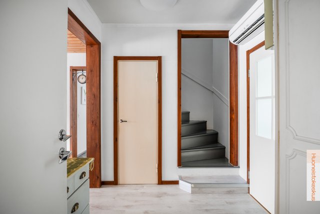 - Yläkerran aulassa maalatut seinät (yksi maalattu betoni) ja laminaattilattia. Rappusten alla olevassa komerossa muovimatto ja maalatut seinät. Eteisessä laattalattia ja maalatut seinät. Eteisessä lattialämmitys, sähköllä.