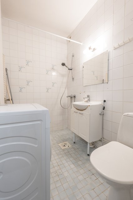 - WC-istuin, peili, allaskaappi, pesukoneliitäntä, pesukone, ja bidee-suihku