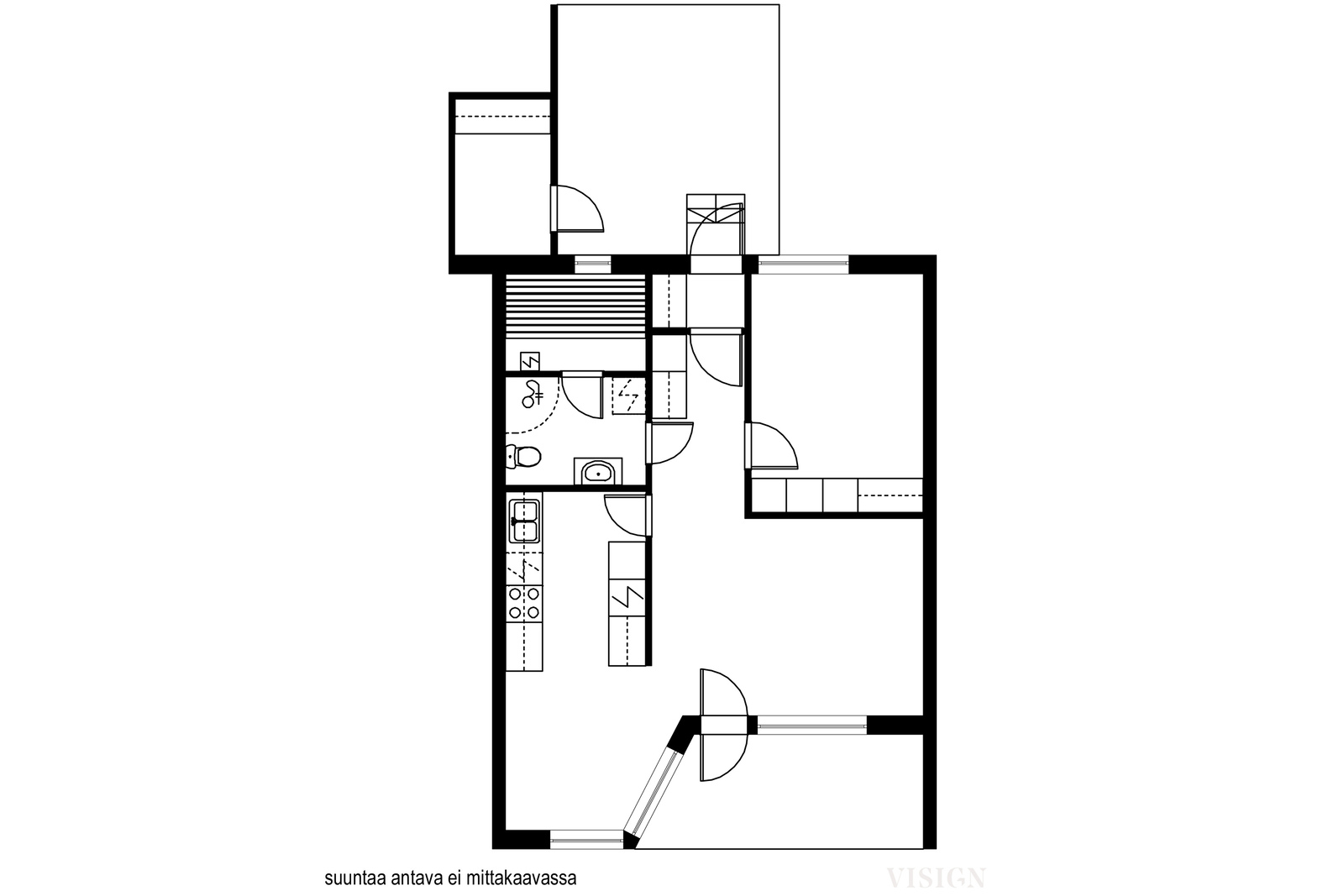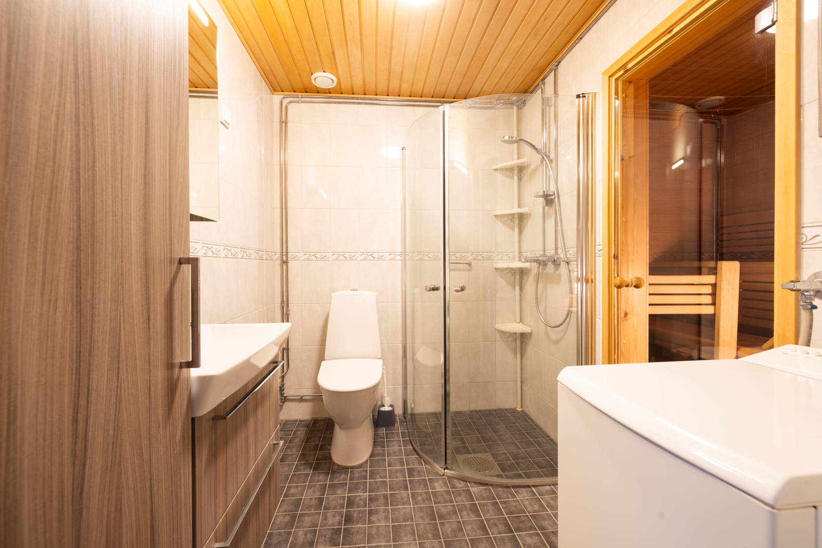 - Lattialämmitys, suihku, pesukoneliitäntä, wc-istuin, peilikaappi, allaskaappi, ja kiinteät valaisimet