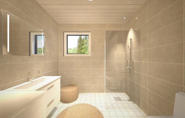 - WC-istuin, suihku, lattialämmitys, allaskaappi, pesuallas, suihkuseinä, ja peili (LED-valopeili)