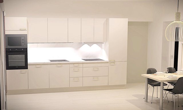 - Kaikki kodinkoneet integroituina. LED-spottivalaistus sekä 2 paikkaa riippuvalaisimille. Työtasojen vakiona laminaatti. Erikseen tilattavissa esim. kvartsikomposiitti tai kivitaso.