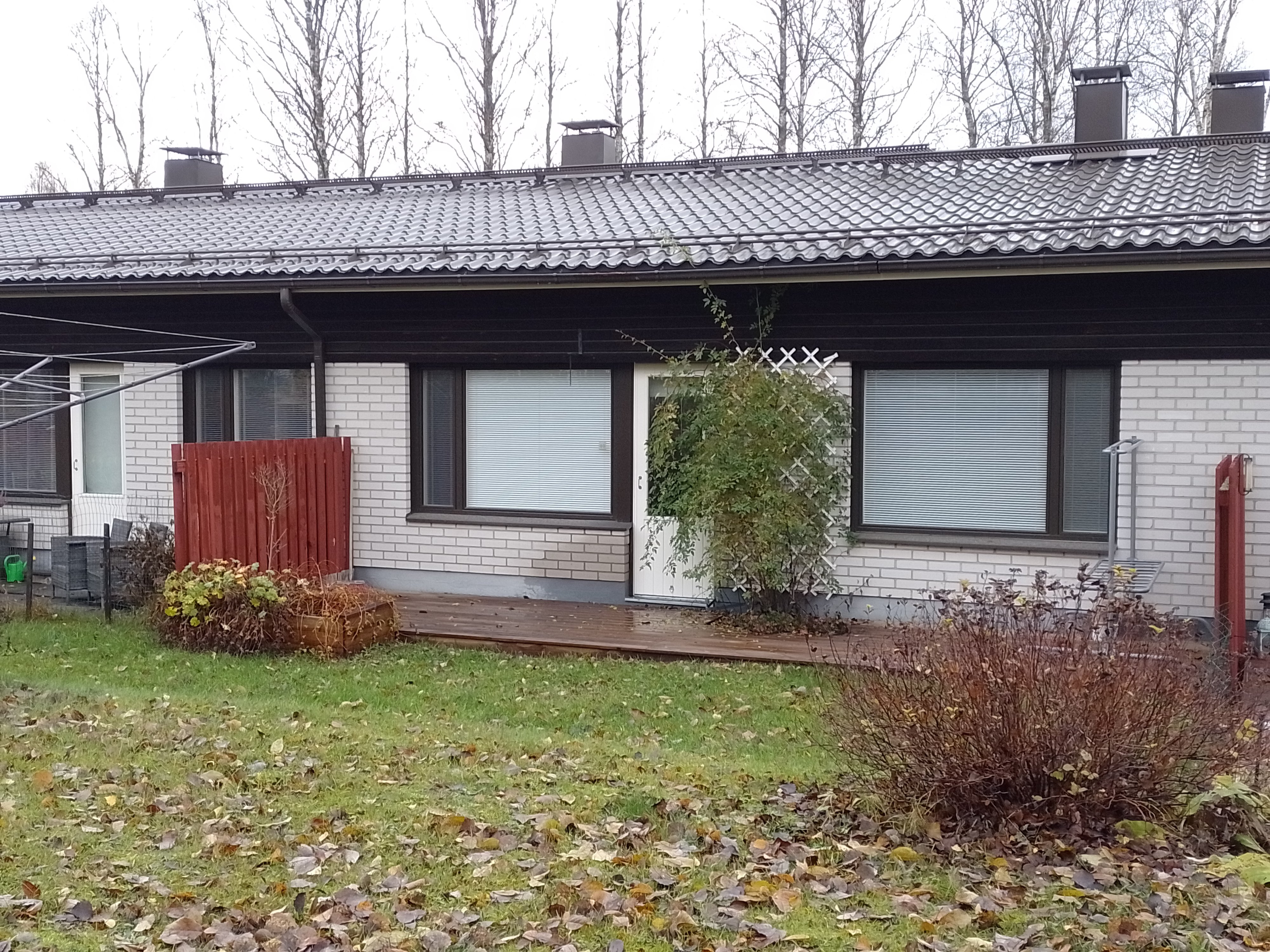 - Koko asunnon levyinen puinen terassi.