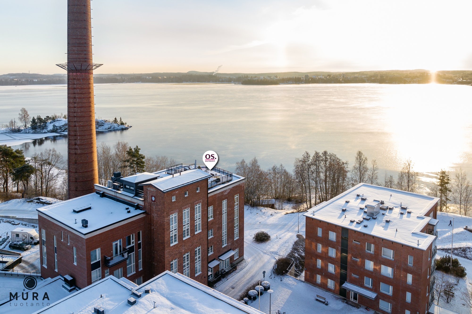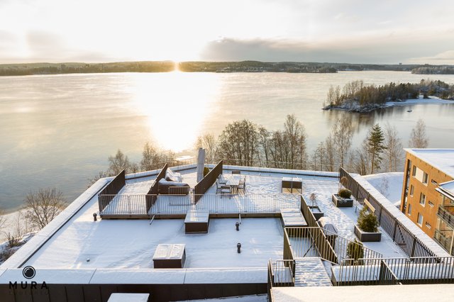 Tämän kulmahuoneiston pohjaratkaisu on erittäin toimiva ja sopii erityisen hyvin pariskunnalle tai pienelle perheelle. Vaikuttavan iso olohuone, keittiö ja ruokailutila ovat yhtä avonaista tilaa. Asunnon kaikista ikkunoista avautuvat henkeäsalpaavat näkymät Pyhäjärvelle. Lisäksi taloyhtiöllä on huikea kattoterassi grilleineen ja aurinkotuoleineen osakkaiden vapaassa käytössä.