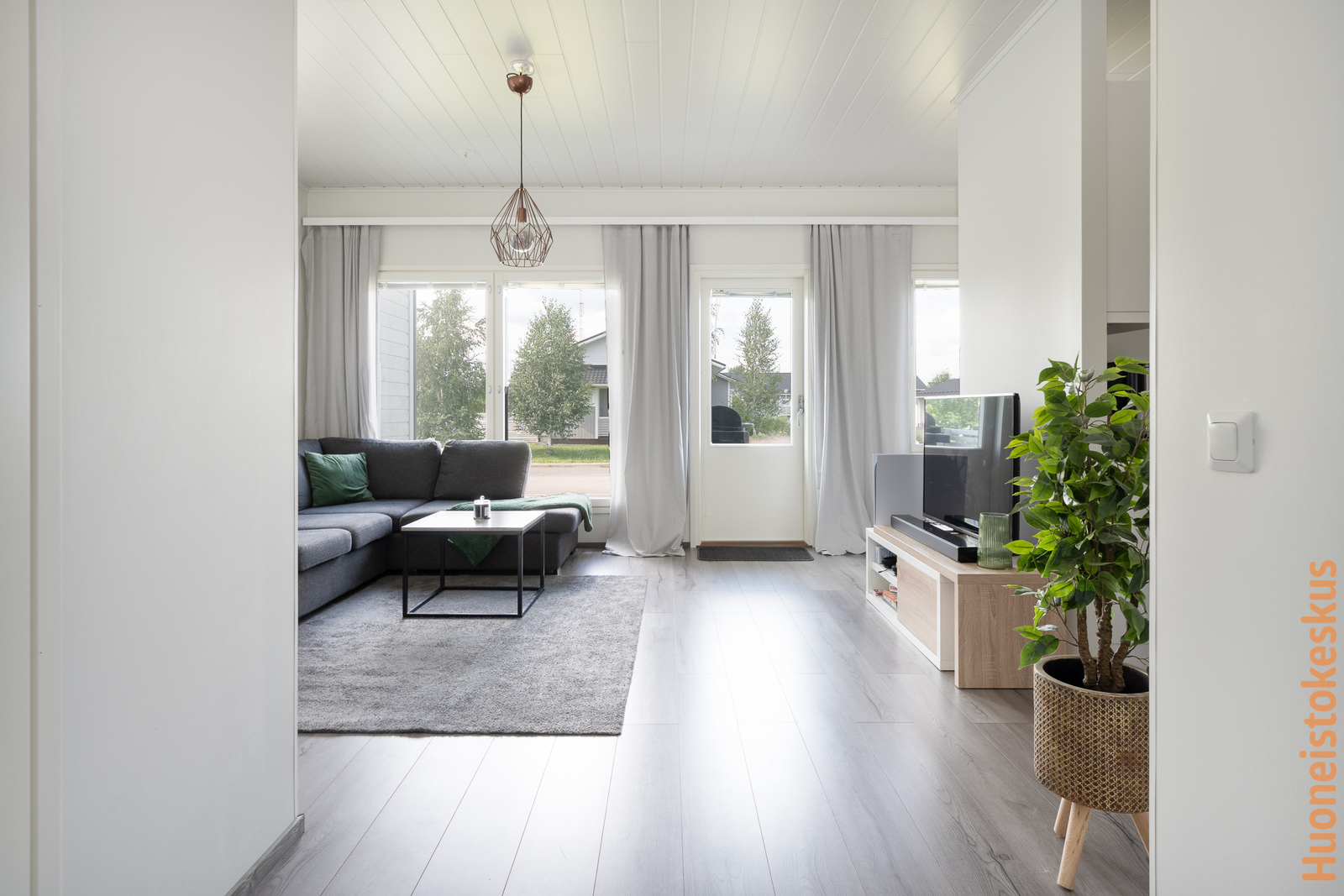 Tässä kodissa on harmoninen värimaailma läpi huoneiston. Lattiat ovat laminaattia/laattaa ja seinät on maalattu. Keittiössä on nykyaikainen varustetaso ja hyvin kaappi- ja laskutilaa. Säilytystilaa on makuuhuoneen kaapistoissa ja sisäänkäynnin vieressä olevassa varastossa. Oleskelupiha on länsiauringon puolella ja olohuoneesta on käynti katetulle terassille.