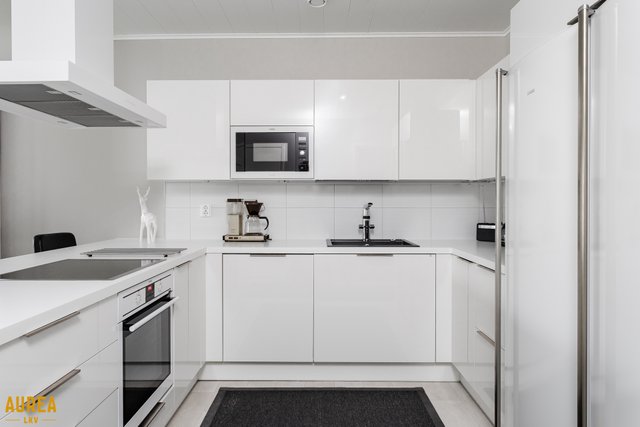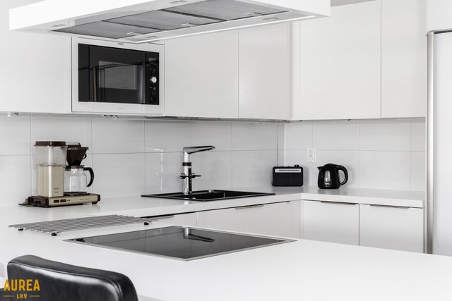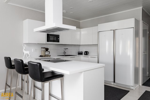 - Puustelli keittiö. Korkeakiilto valkoiset kaapistot, iso saareke. Välitilassa laatta. Komposiittiallas. Integroitu mikro, uuni (kiertoilma), induktioliesi, jääkaappi, pakastinkaappi, astianpesukone, led valaistus.