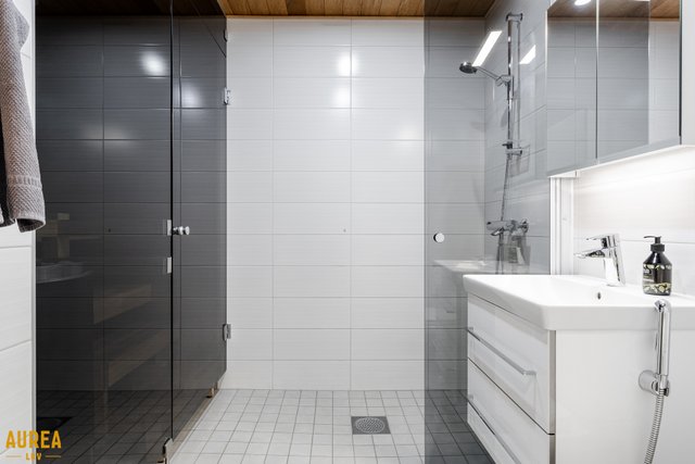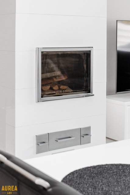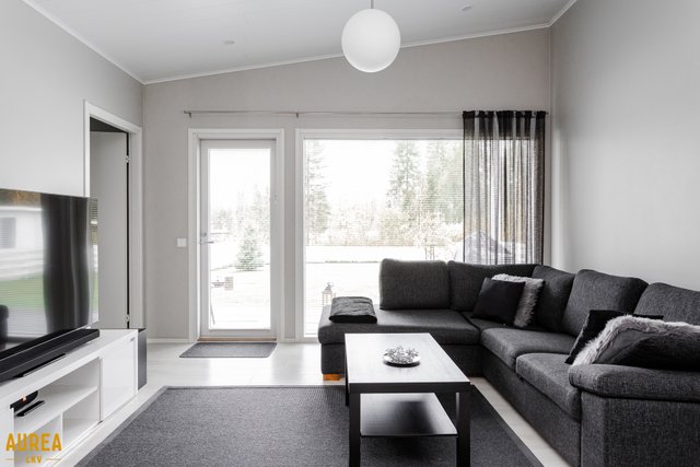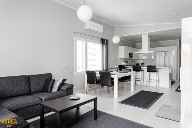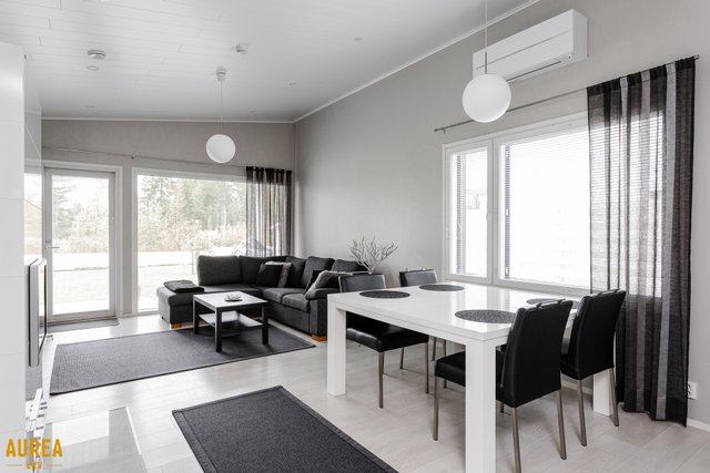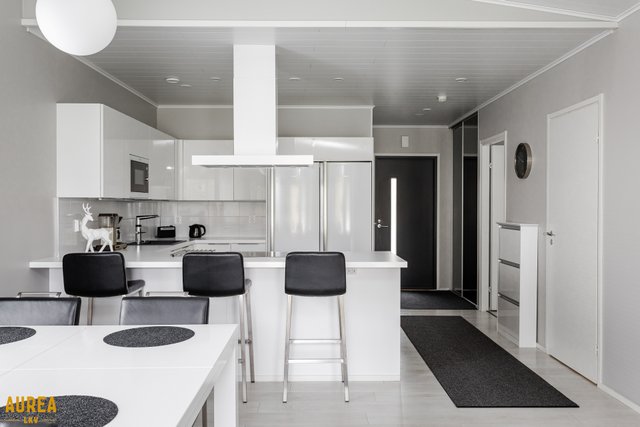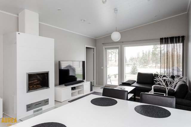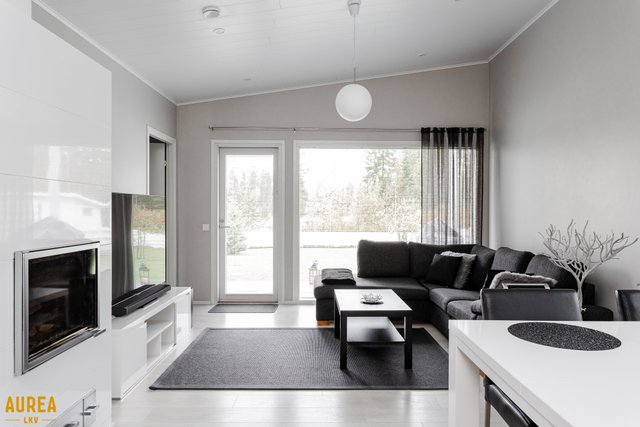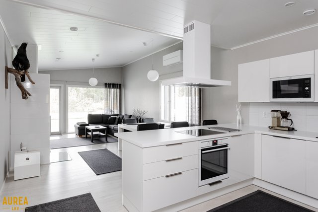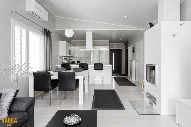 Avarassa olohuone-keittiötilassa on korotettu sisäkatto ja suuret ikkunat, jotka tulvivat valoa ja tuovat tilaan ilmavuutta. Tyylikäs vaalea Puustellin keittiö tarjoaa runsaasti säilytystilaa ja laadukkaat kodinkoneet. Olohuoneessa viihtyvyyttä luova tunnelmallinen takka ja ilmalämpöpumppu. Kokonaissähkönkulutus onkin ollut varsin maltillinen, noin 9.500kwh/vuosi.
