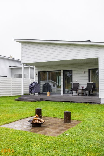 Sisäänkäynnin yhteydessä on käytännöllinen varasto/tekninentila. Autokatospaikan yhteydessä on suurempi ulkovarasto, ja lisäksi pihassa on toinen pistokkeellinen autopaikka. Suojaisa takapiha rajoittuu puistikkoon ja tarjoaa rauhallisen ympäristön oleskeluun – pihalta löytyy myös nuotiopaikka. Vierestä löytyy hiihtoladut ja maastopyöräreitit sekä viihtyisät metsäpolut. Lähietäisyydellä olevan koulun pihasta löytyy mysö ulkokuntosali sekä rullakiekkokaukalo.